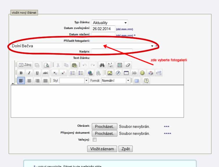 fotogalerie musí, ve chvíli kdy článek píšete, existovat! Musíte si tedy galerii vytvořit PŘEDEM.