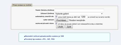 Zaškrtnutí "zachovat původní název " doporučuji nechat zaškrtnuté. Pokud nebude tato volba zaškrtnuta, přejmenuje se u uložišti soubor dle následujícího klíče:"img_+ id_záznamu+typ souboru takže například obrázek, který se ve vašem PC jmenoval "můj krásný obrázek.jpg" se přejmenuje na "img_362.jpg" - další možnost je obrázek nahrát z formuláře " Fotogalerie" zde si můžete spustit stejný formulář jako v předcozím bodu, pouze s tím rozdílem že obrázek bude rovnou přiřazen k aktuální fotogalerii.